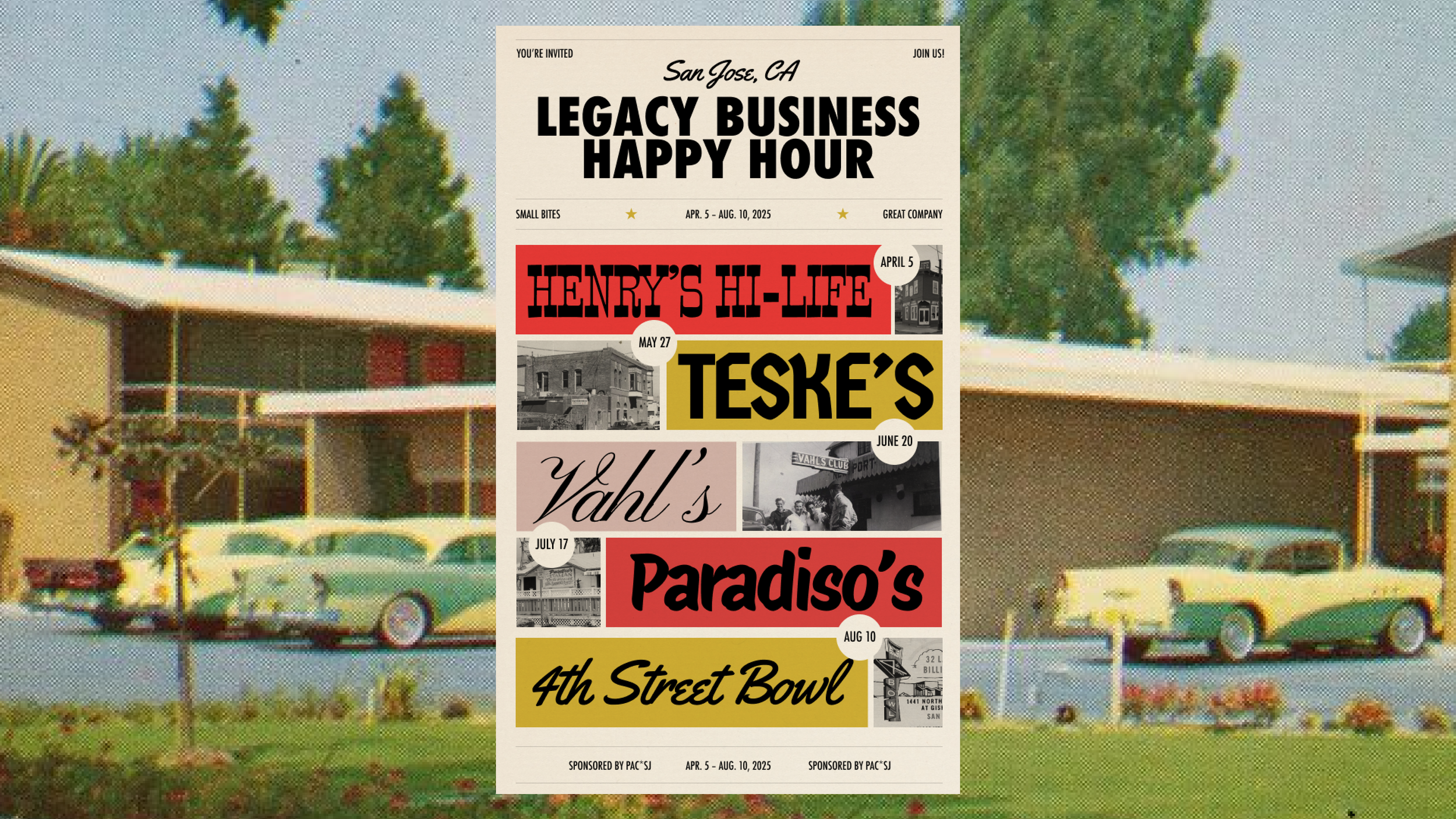 (2025) Poster for a happy hour series celebrating the legacy businesses of my hometown, San Jose, California. Inspired by the signage, matchbooks, and facade of each business. Hosted by the Preservation Action Counsel of San Jose.